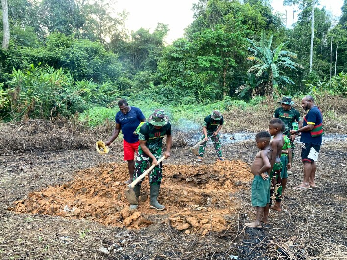 FOKUSPOST.COM | Boven Digoel ~ Satgas Pamtas Statis RI-PNG Yonif 111/KB Pos Rawa Bustop mengajak Masyarakat untuk mandiri dengan kegiatan bercocok tanam di Distrik Jair Kab.Boven Digoel Papua Selatan, Selasa (24/10/2023)