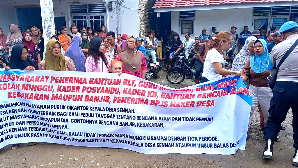 Tak hanya itu sekelompok perangkat desa dengan atribut lengkap juga bentangkan spanduk bertuliskan kan ” Kami perangkat desa sennah tidak setuju adanya unjuk rasa di kantor desa sennah karena mengganggu administrasi pelayanan terhadap masyarakat” Dengan sesekali meneriaki massa aksi unjuk rasa menggunakan Sound system besar yang terparkir di depan kantor Desa.