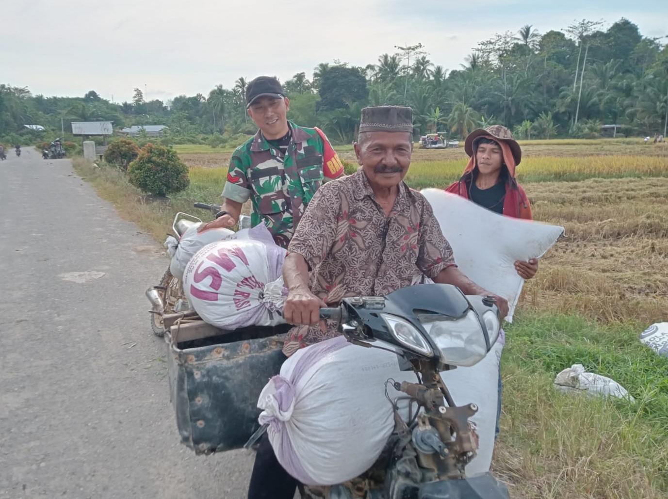 FOKUSPOST.COM | Aceh Timur – Koptu Ridwan Hermawan selaku Babinsa Koramil 18/Banda Alam Kodim 0104/Aceh Timur aktif melakukan pendampingan dengan membantu petani mengangkut padi hasil panen milik Saifullah di Desa Panton Rayeuk A, Kecamatan Banda Alam, Kabupaten Aceh Timur, Rabu (28/03/2023).
