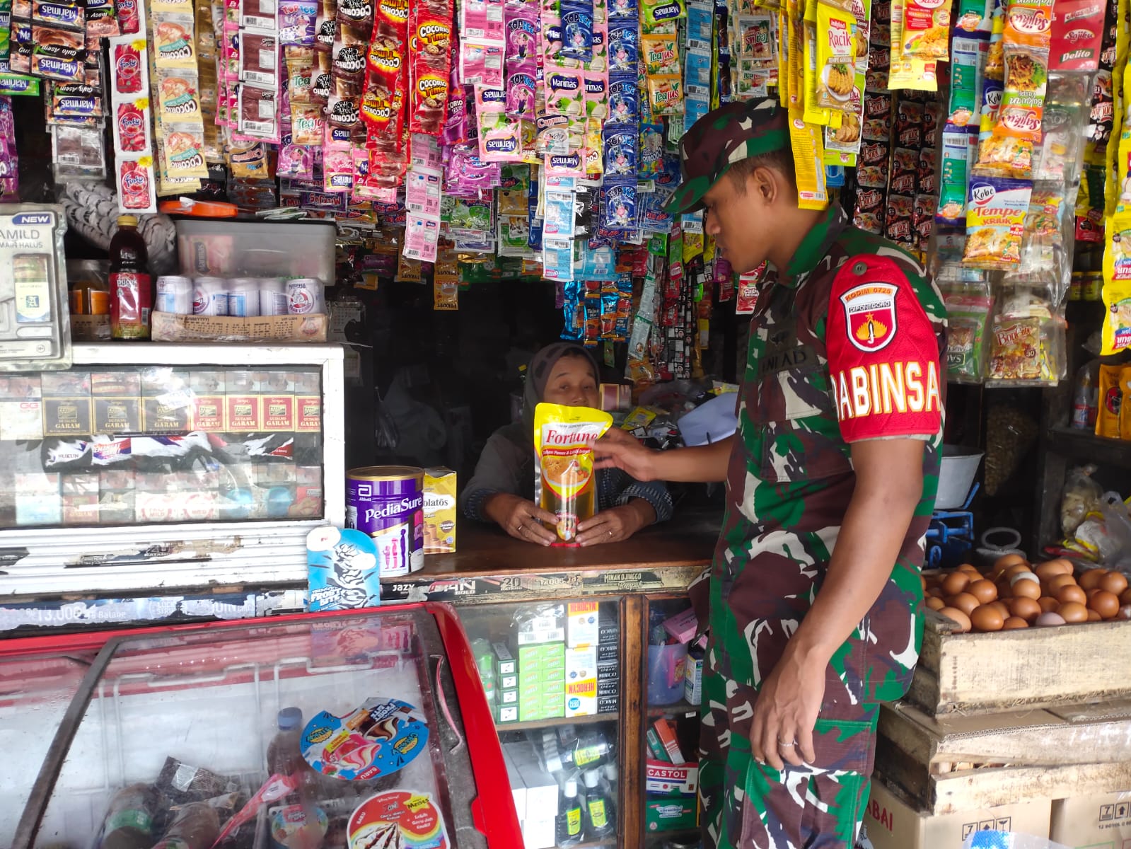FOKUSPOST.COM | Sragen – Guna mengantisipasi lonjakan harga dan kelangkaan bahan sembako menjelang datangnya Lebaran Tahun 2023, Serda Sigit Babinsa Ds. Plumbon Koramil 09/Sambungmacan Kodim 0725/Sragen melaksanakan pemantauan harga sembako yang ada Kios – Kios di Ds. Plumbon Kec. Sambungmacan, Rabu (12/04/2023 ).