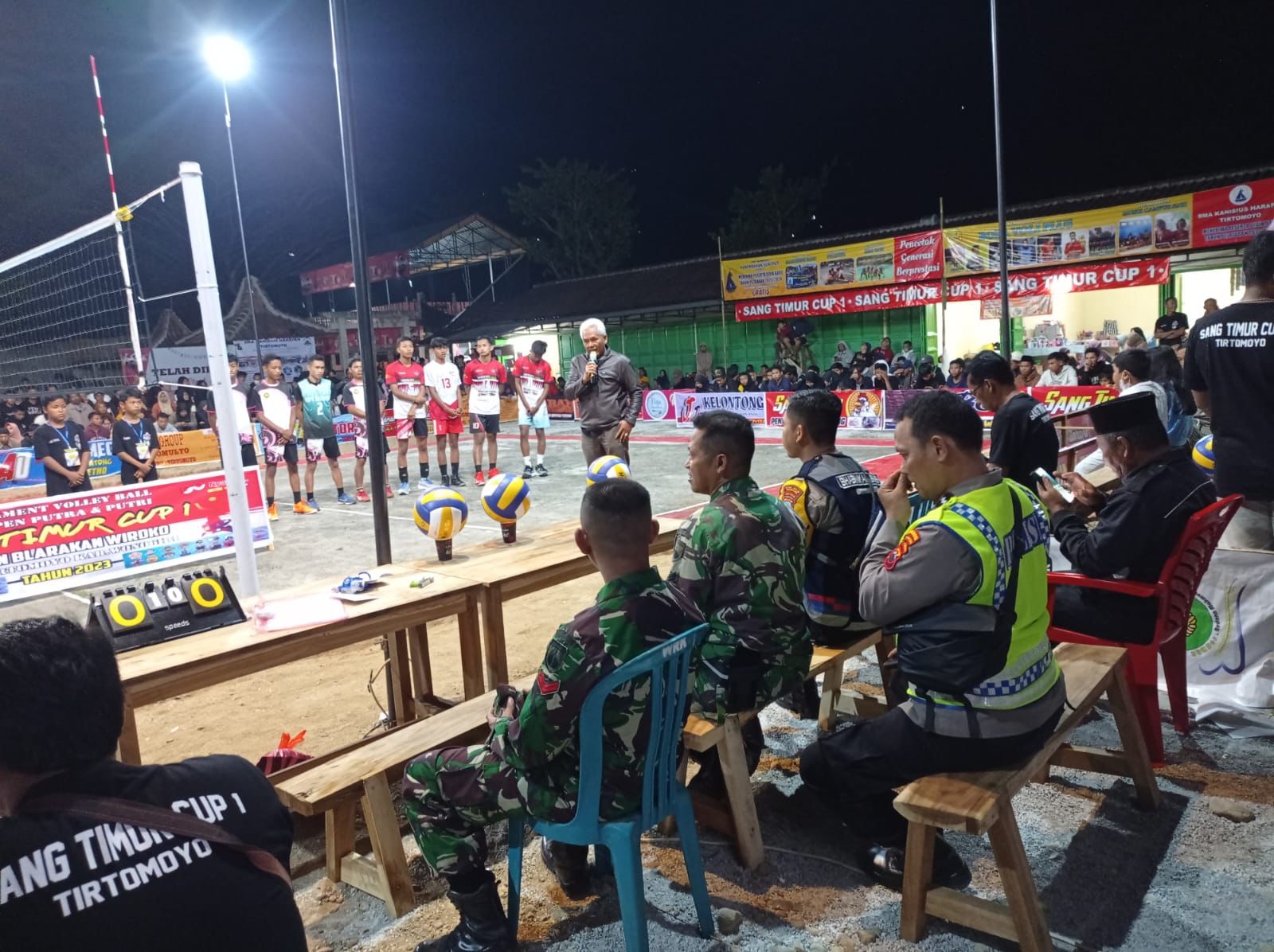 FOKUSPOST.COM | Wonogiri – Sinergitas yang terjalin antara anggota Koramil dan Polsek Tirtomoyo terlihat dalam melaksanakan pengamanan Turnamen Bola Volly Sang Timur Cup I, di lapangan Bola Volly, Dusun Blarakan Desa Wiroko, Kecamatan Tirtomoyo. Minggu (11/06/2023) malam.