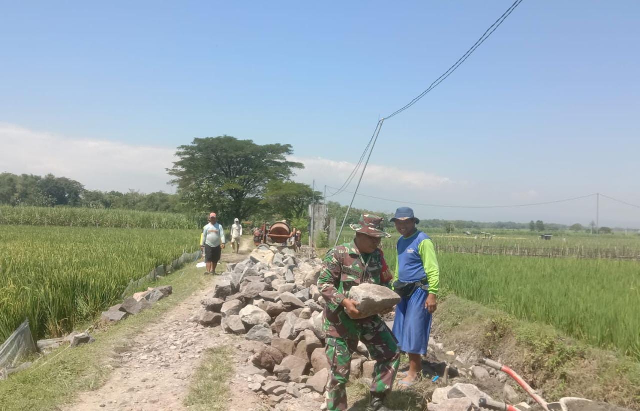 Sertu Suyono terlihat bersemangat, bekerja sama dengan warga mengangkat bongkahan batu pondasi yang berat untuk pembangunan talud disepanjang dusun Tanggulangin. Kucuran keringat membasahi badan dan tentunya menahan panasnya terik matahari.
