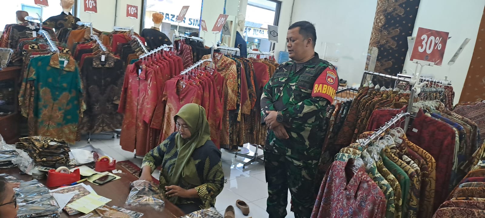 FOKUSPOST.COM | Surakarta – Babinsa kelurahan kemlayan Koramil 03/Serengan Kodim 0735/Surakarta Serda Catur Handoko komsos dengan pegawai batik danarhadi Ibu Handayani yang berada di wilayah kelurahan kemlayan Serengan Kota Surakarta, 01/05/2023)
