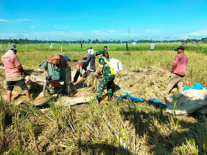 FOKUSPOST.COM | Aceh Timur – Dalam upaya mendukung ketahanan pangan di wilayah Desa Tanah Rata, Serda Puji Raharjo Babinsa Koramil 04/Peureulak, Kodim 0104/Aceh Timur, turut serta membantu petani dalam kegiatan perontokkan padi, di Desa Tanah Rata, Kecamatan Peureulak, Aceh Timur, Kamis (16/11/2023).