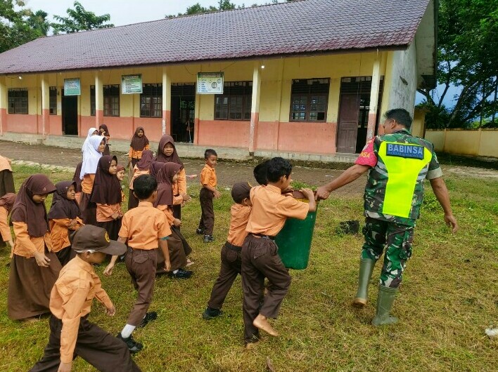 FOKUSPOST.COM | Aceh Timur – Sertu Muhlisin Babinsa Koramil 10/Simpang Jernih, Kodim 0104/Aceh Timur, mengajak murid SDN Batu Sumbang untuk bersama-sama menjaga kebersihan lingkungan sekolah.