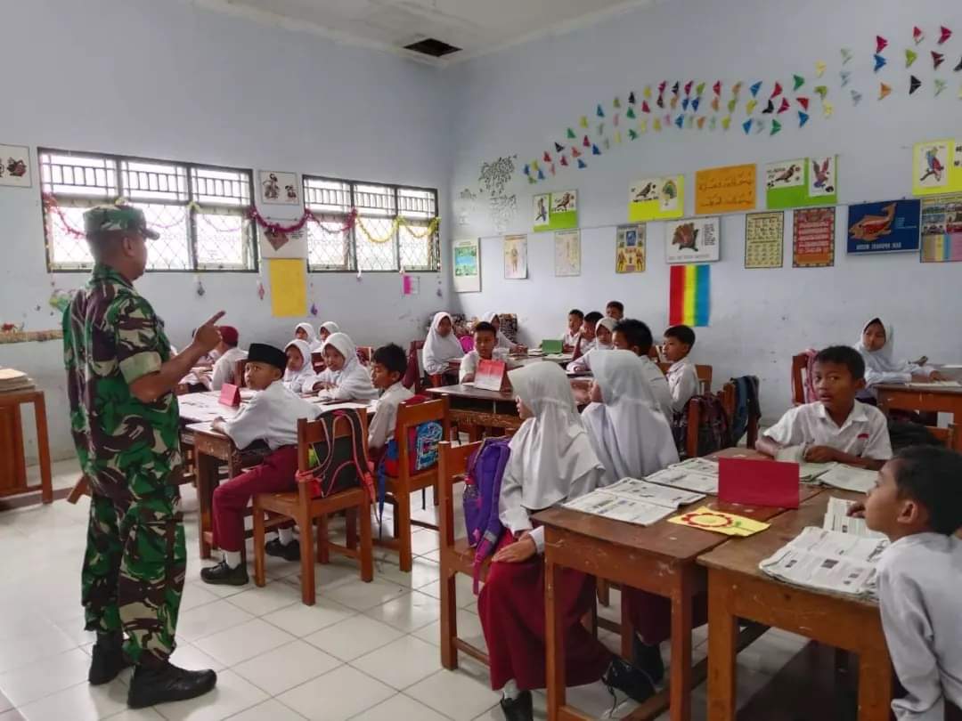 FOKUSPOST.COM | KEBUMEN – KODIM 0709/KEBUMEN. Wujud dari kepedulian dan perhatian terhadap generasi penerus bangsa, Babinsa Koramil 13/Buluspeantren memberikan materi Wawasan kebangsaan tentang Ideologi Pancasila dalam menumbuhkan sikap disiplin dan membentuk karakter kepada Murid kelas 6 SDN Rantewringin, Senin (03/04/2023).