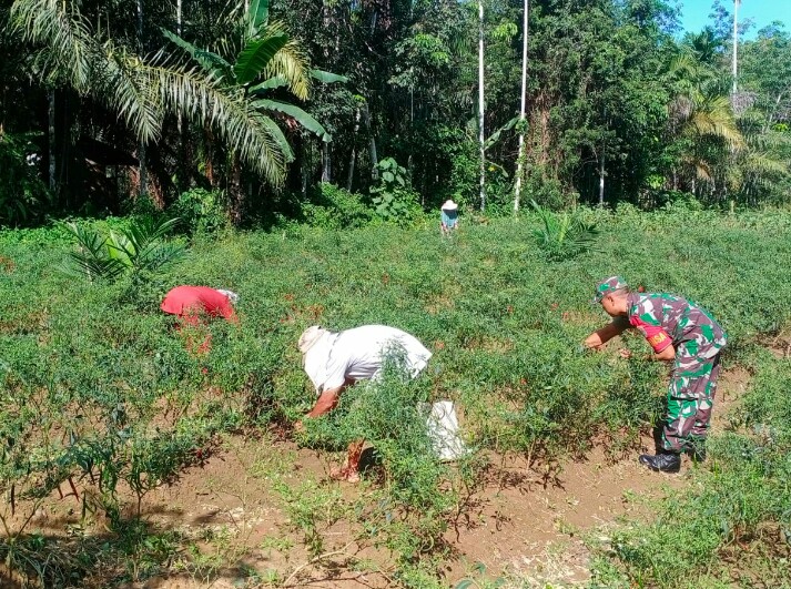 FOKUSPOST.COM | Aceh Timur – Meningkatkan ketahanan pangan dan ekonomi lokal, Babinsa Koramil 14/Rtp, Kodim 0104/Aceh Timur, Sertu Andi membantu dalam panen cabai merah milik Bapak Suyanto luas lahan 3 Rante, Bertempat di Desa Paya Palas, Kecamatan Rantau Peureulak, Kabupaten Aceh Timur, Senin (13/11/2023).
