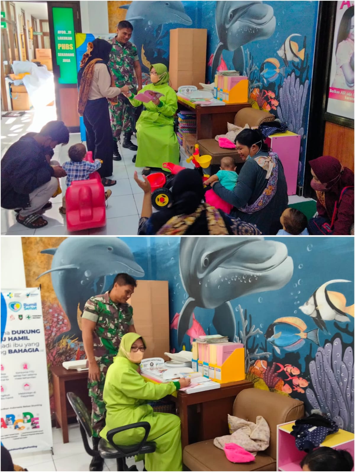 Petugas Puskesmas Kratonan didampingi Bati Bakti TNI Koramil 03/Serengan mulai melakukan Imunisasi terhadap anak usia 0-24 Bulan. Bidan Gigih Dwi Jayanti menjelaskan Imunisasi adalah pemberian vaksin dengan tujuan agar mendapatkan perlindungan (Kekebalan) dari penyakit infeksi yang dapat dicegah dengan Imunisasi ini