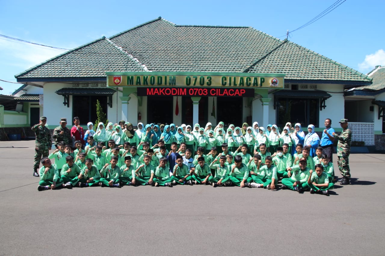 Rombongan siswa siswi SD Al Irsyad 01 Cilacap bersama para guru pendamping diterima oleh Instruktur Kodim 0703 Cilacap Serka Yatiman, Asisten Instruktur Sertu Risam dan Serda Guntoro di Lapangan Makodim 0703 Cilacap.