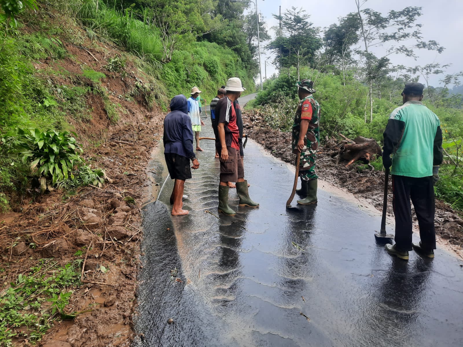 Babinsa dan anggota Koramil 21/Bulukerto lainnya bersama perangkat desa dan warga beserta relawan melaksanakan karya bakti pembersihan material longsor yang menutup akses jalan.