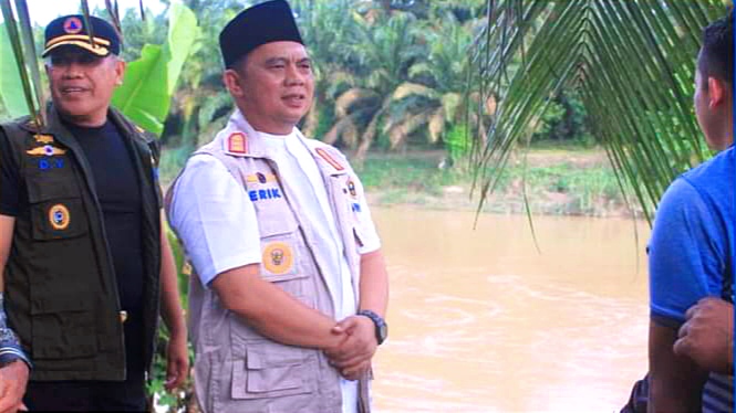 Bupati Labuhanbatu dr. H. Erik Adtrada Ritonga, MKM didampingi Kepala Badan Penanggulangan Bencana Daerah Labuhanbatu Drs. Darwin Yusma, M.AP meninjau langsung Erosi Sungai Bilah di Desa Tanjung Harapan dan Jalan dari Jalan Tapian Nauli yang menghubungkan ke dusun suko sari Kecamatan Pangkatan, Jumat (8/12/2023).