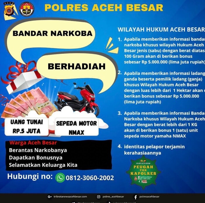 FOKUSPOST.COM | BANDA ACEH — Polres Aceh Besar mengadakan sayembara berhadiah uang tunai dan satu unit sepeda motor bagi yang memberikan informasi bandar narkoba jenis sabu dengan berat diatas 100 gram, informasi ladang ganja dan pemiliknya, dan informasi bandar narkoba dengan berat lebih dari 1 kg, khususnya di wilayah Aceh Besar.