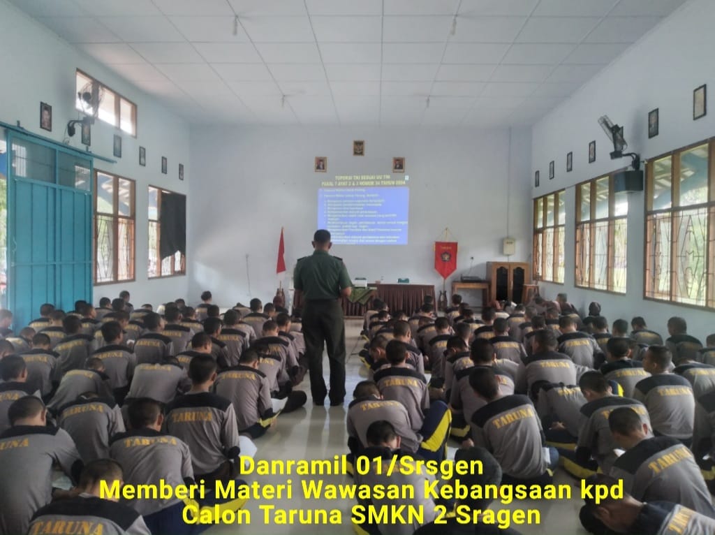 FOKUSPOST.COM | Sragen – Untuk menumbuhkan jiwa nasionalisme generasi muda dalam membentuk kader-kader bangsa yang terampil, disiplin dan cinta tanah air, Kapten Inf. Kukuh Prihatin Danramuil 01/Sragen memberikan wawasan kebangsaan (Wasbang) kepada 134 siswa-siswi SMKN 2 Sragen Jln Sutomo No. 4 Sragen, Jum’at (24/02/2023).