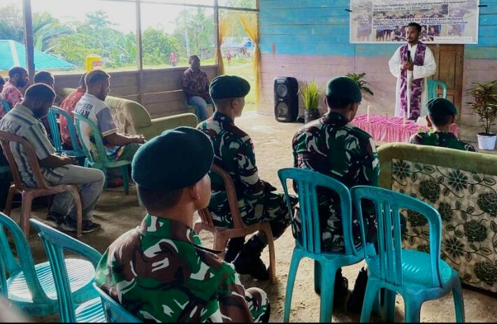 FOKUSPOST.COM | Boven Digoel ~ Satgas Pamtas Statis RI -PNG Yonif 111/KB yang bertugas di Sektor Kolakops Korem 174/Anim Ti Waninggap Wilayah Perbatasan Kab. Boven Digoel Papua Selatan melalui Komsos mengajak Masyarakat dan Pemuda untuk jaga perdamaian dan tidak terpengaruh oleh isu atau ajakan kelompok Kriminal Separatis Teroris (KST) jelang 1 Desember, Jum’at 24/11/2023,