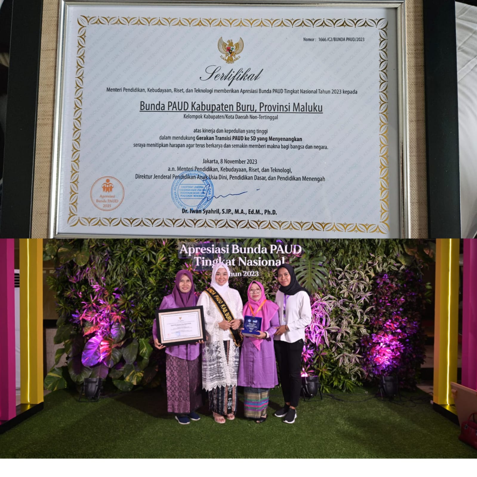 FOKUSPOST.COM | Maluku – Ketua penggerak PKK Kabupaten Buru, drg. Mega Aziza Salampessy mendapat penghargaan tingkat Nasional sebagai Bunda PAUD Kabupaten Buru.