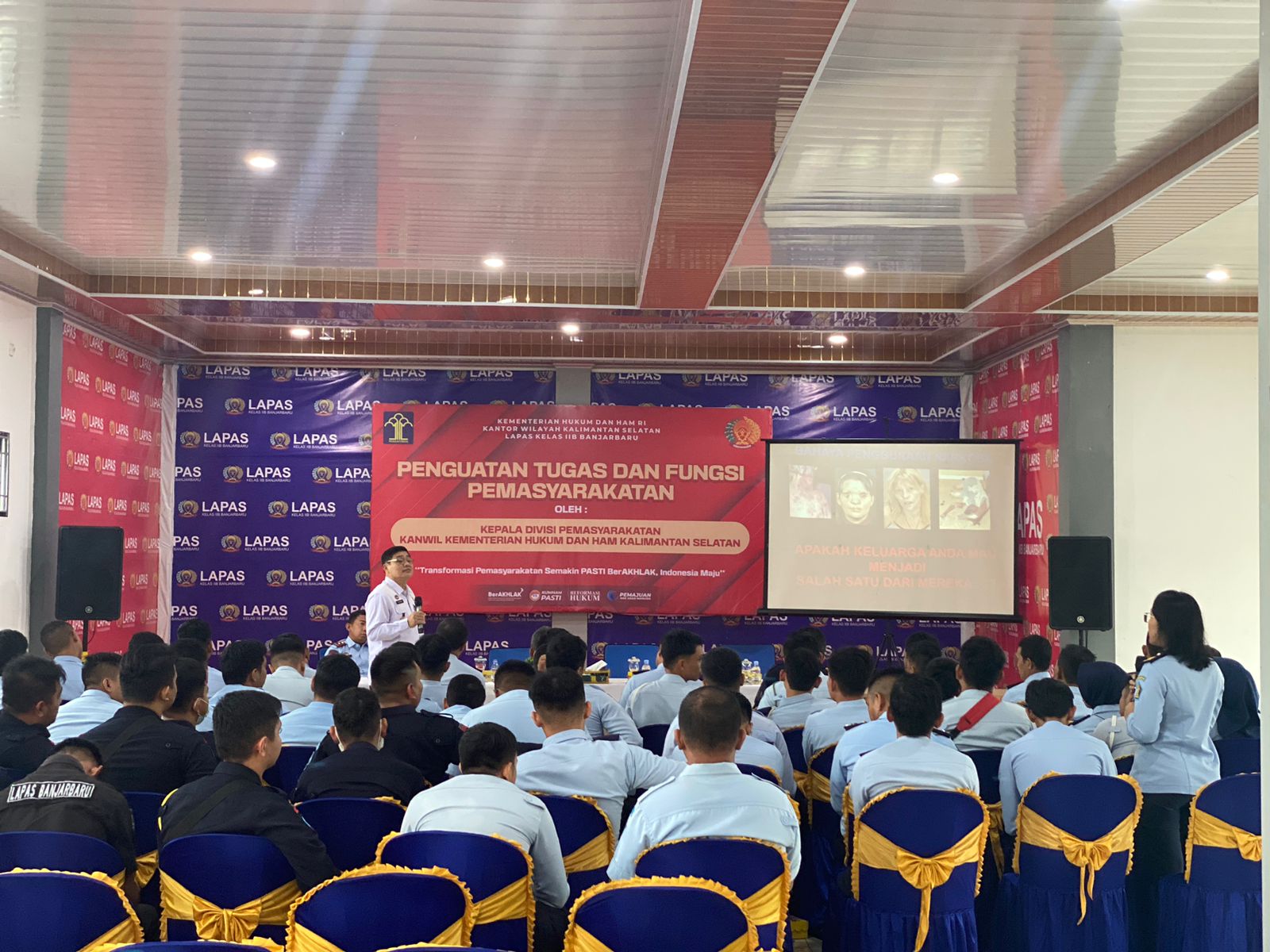 FOKUSPOST.COM |Banjarbaru, – Kepala Divisi Pemasyarakatan Kanwil Kemenkumham Kalsel, Sri Yuwono berikan Penguatan Tugas Pokok dan Fungsi (TUSI) Pemasyarakatan kepada para Petugas Lapas Kelas IIB Banjarbaru yang bertempat di Aula Lapas Banjarbaru, Rabu (10/5/2023).