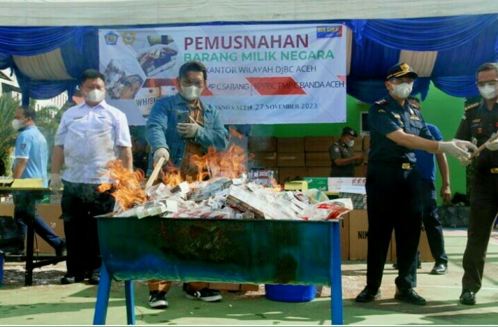 FOKUSPOST.COM | Banda Aceh – Kantor Wilayah (Kanwil) Direktorat Jenderal Bea dan Cukai(Bea Cukai) Aceh bersama Kantor Pengawasan dan Pelayanan Bea dan Cukai (KPPBC) Tipe Madya Pabean (TMP) C Sabang dan KPPBC TMP C Banda Aceh musnahkan rokok dan berbagai jenis barang ilegal lainnya.