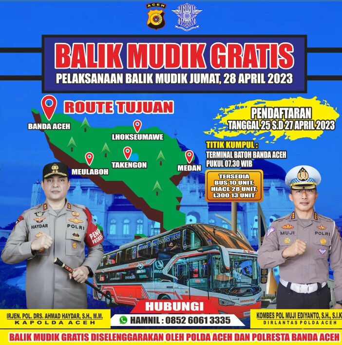 Ia menjelaskan, armada balik mudik gratis tersebut dikoordinir Dirlantas Polda Aceh Kombes Muji Ediyanto. Bagi masyarakat yang ingin menikmati fasilitas balik mudik gratis tersebut silakan mendaftar dari 25-27 April 2023 melalui nomor handphone: 085260613335.