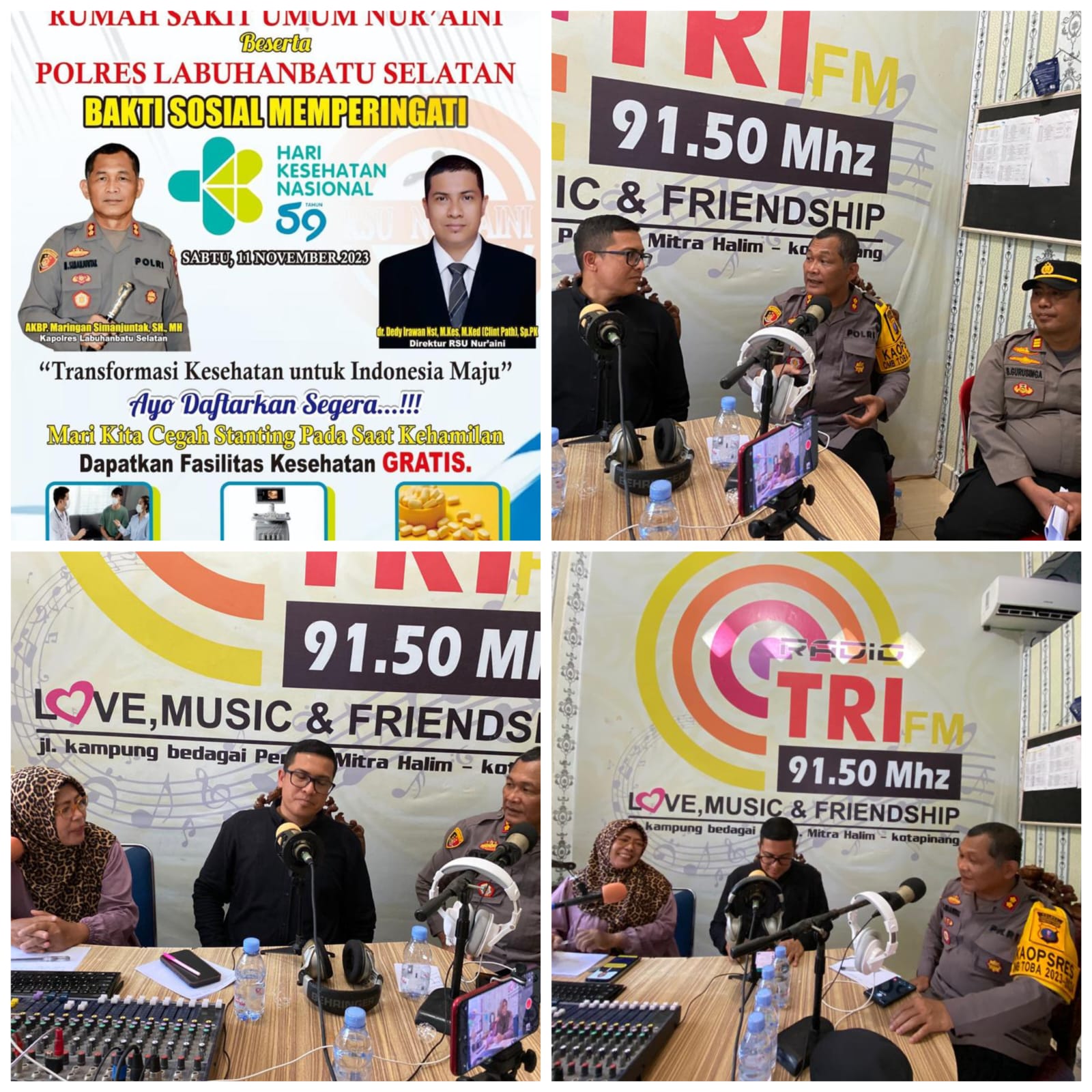 FOKUSPOST.COM | Labuhanbatu Selatan – Dalam rangka mensosialisasikan Pelaksanaan Bakti Sosial (Baksos) Pengobatan gratis dalam rangka Hari Kesehatan Nasional (HKN) yang akan dilaksanakan di Rumah Sakit Umum (RSU) Nur Aini Blok Songo, Kapolres Labuhanbatu Selatan AKBP MARINGAN SIMANJUNTAK, SH.,M.H., bersama Direktur RSU Nur Aini Blok Songo Dr.DEDY IRAWAN NASUTION, M.Kes., melakukan Talkshow di Radio Tri Bagas Swara 91,50 FM yang berada dijalan Mitra Halim Kelurahan Kotapinang Kecamatan Kotapinang Kabupaten Labuhanbatu Selatan Propinsi Sumatera Utara, Jum’at (10/11/2023).