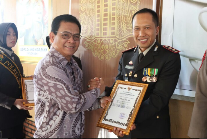 Penghargaan ini diserahkan langsung oleh Pj. Bupati Simeulue di Joglo Polres Simeulue, adapun yang menerima penghargaan tersebut adalah, Kapolres Simeulue AKBP Jatmiko S.H.,M.H beserta sebelas anggota Polres Simeulue.
