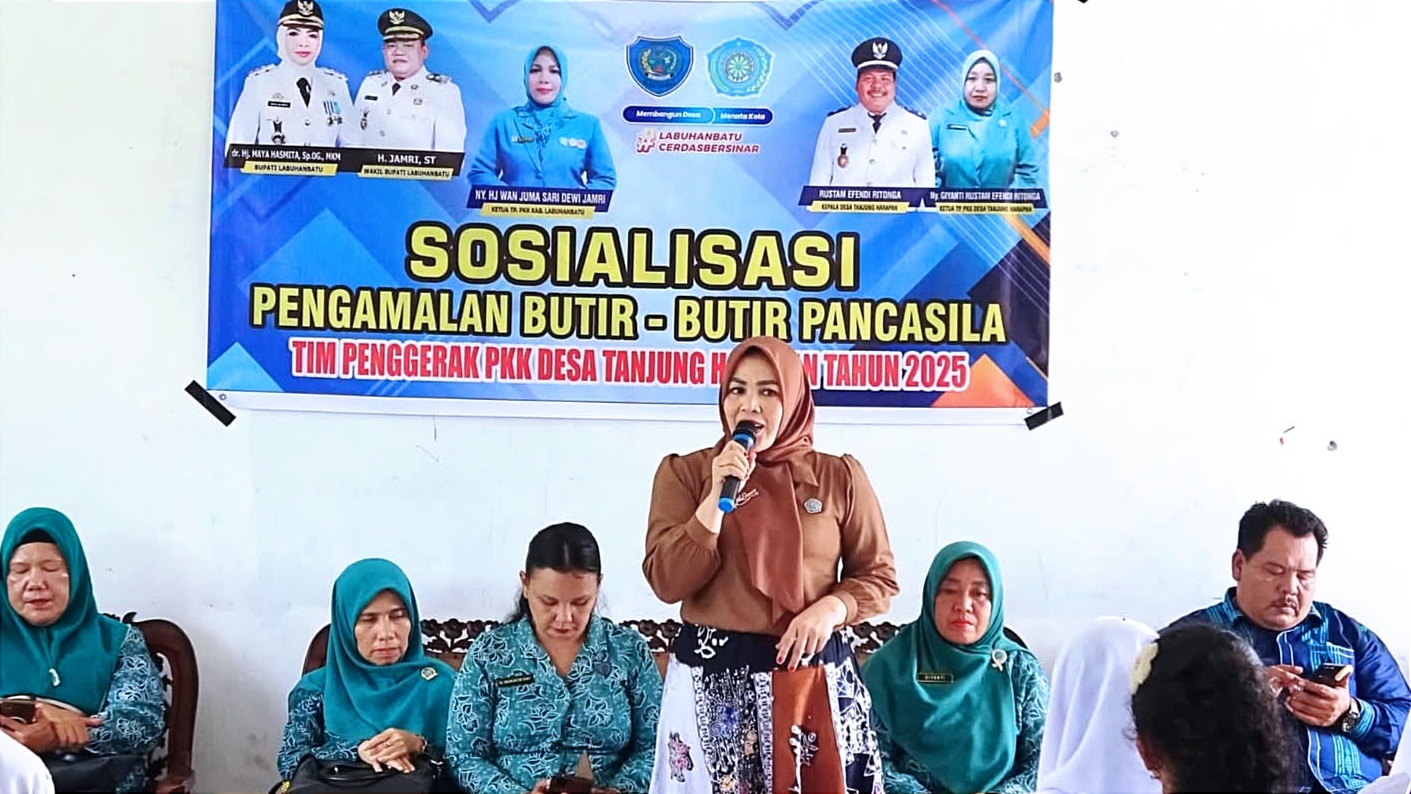 Ketua TP-PKK Labuhanbatu Ny. Hj. Wan Juma Sari Dewi Jamri membuka Sosialisasi Pola Asuh Anak dan Remaja di Desa Tanjung Harapan, yang digelar di Aula Kantor Kepala Desa Tanjung Harapan, Kecamatan Pangkatan. Kamis (18/9/2025).