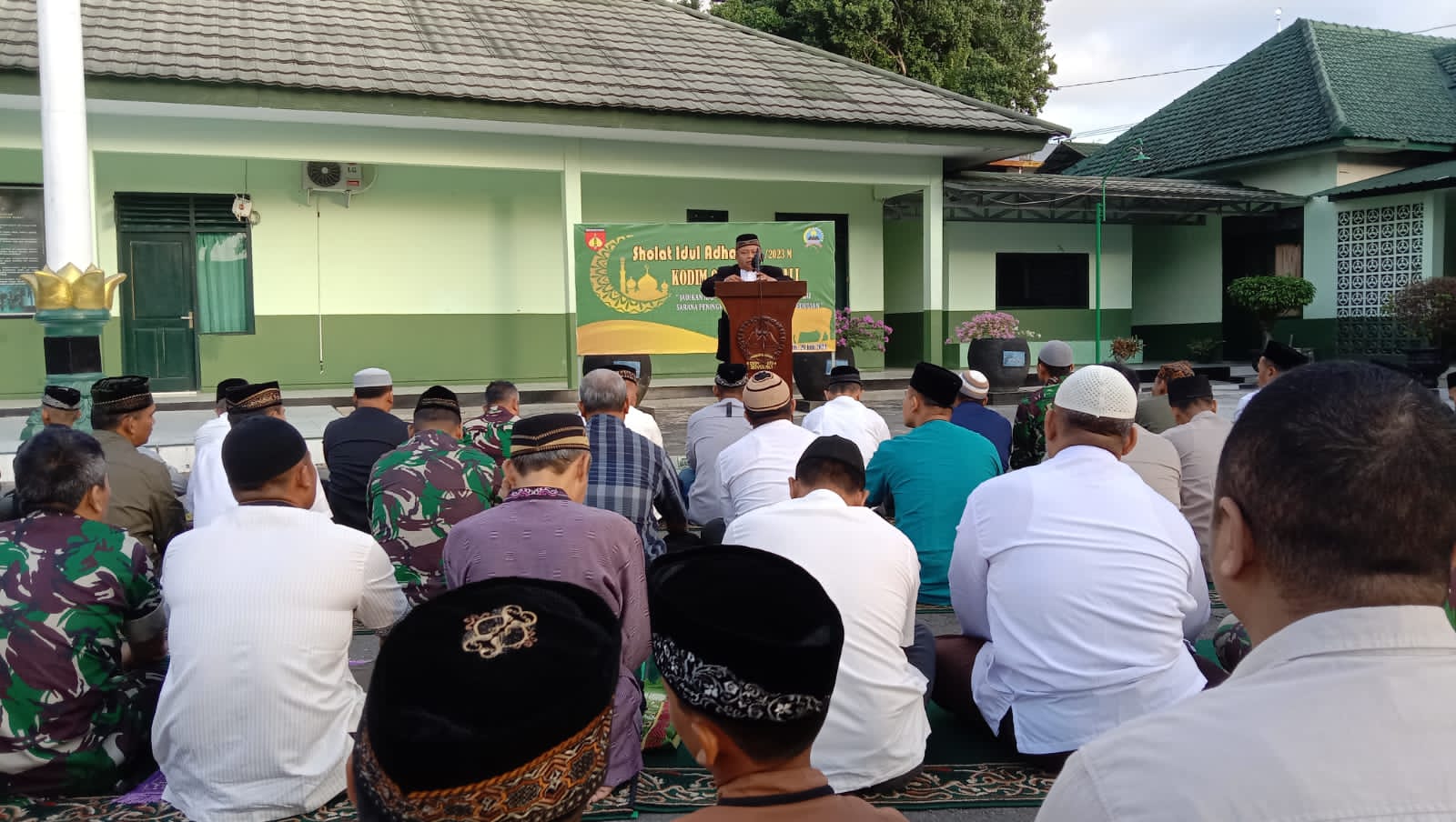 FOKUSPOST.COM | Boyolali – Kodim 0724/Boyolali beserta jajaran menggelar shalat Idul Adha 1444 H tahun 2023 bersama masyarakat sekitar di Lapangan Makodim 0724/Boyolali Jalan Padanaran Desa Tegalmulyo Kecamatan Mojosongo Kabupaten Boyolali. Kamis ( 29/06/23)