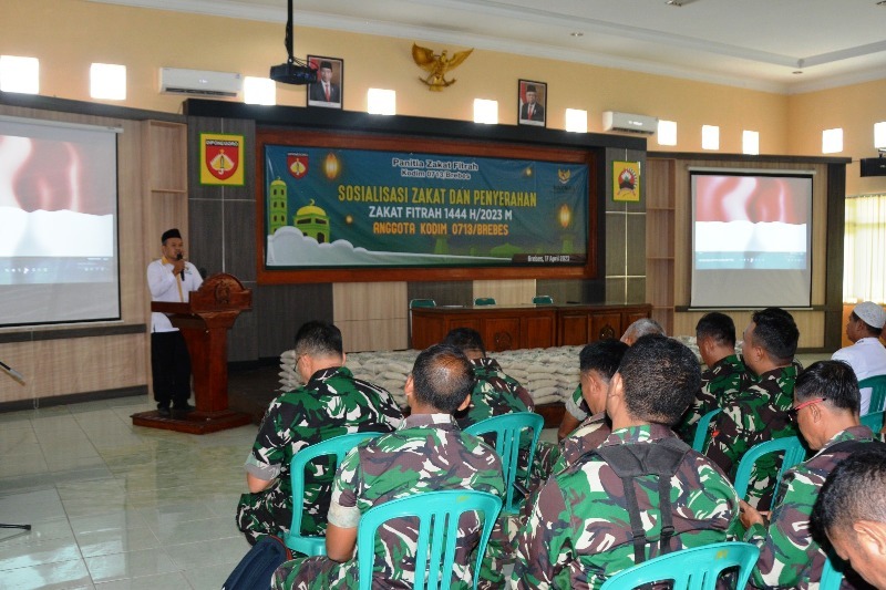 FOKUSPOST.COM |Brebes – Kodim 0713 Brebes menyalurkan zakat fitrah anggota kepada warga masyarakat yang berhak menerimanya, di Aula Jenderal Soedirman Makodim tersebut. Senin (17/4/2023).