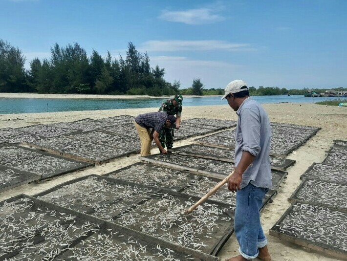 “Selain berkomunikasi kita juga melihat langsung sekaligus membantu proses penjemuran bahan baku ikan teri yang nantinya jemur untuk dijadikan ikan asin”, ujarnya.
