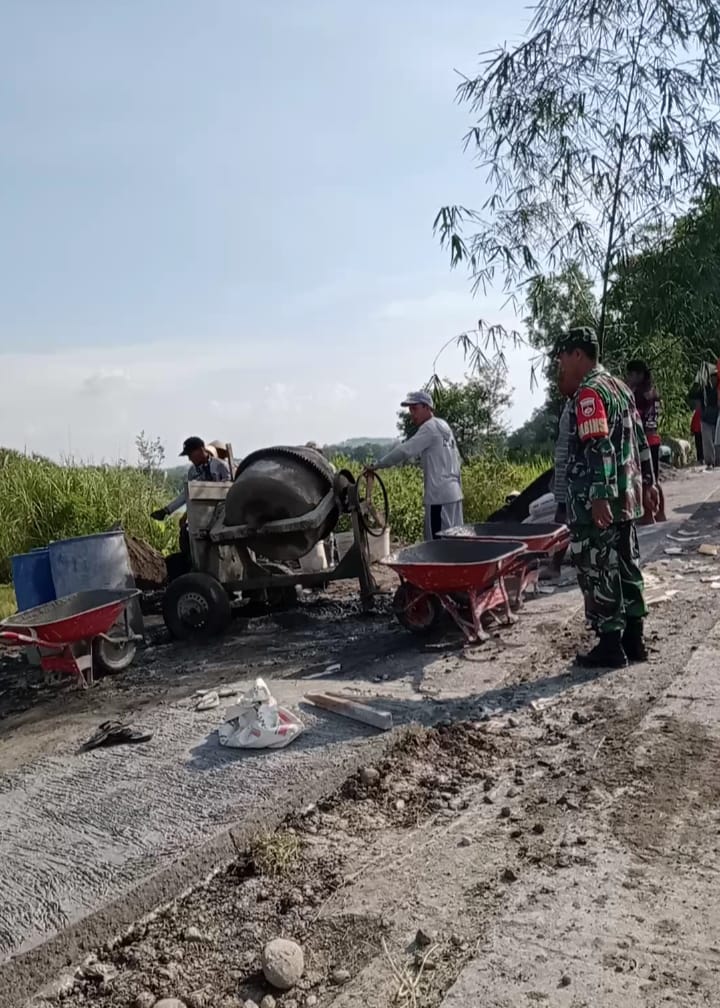 Dalam hal ini Babinsa Serma Paimin tanpa ragu memegang alat sorong dan mengaduk campuran material bersama warga, untuk memperkeras jalan desa di wilayah binaannya, karena akses jalan tersebut sangat penting bagi pengguna jalan di desa setempat.