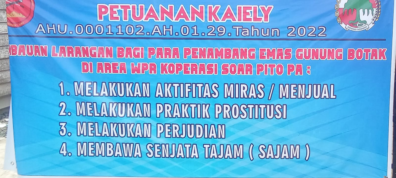 Seperti yang terpampang di Spanduk koperasi SOAR PITO SOAR PA. Dilarang keras oleh penambang Emas siapa pun yang beraktifitas di Gunung Botak (GB) maupun yang berdomisili di Desa Persiapan Wamsait, di antaranya :