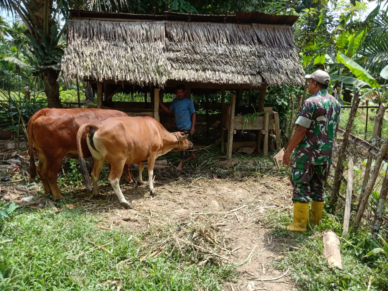 FOKUSPOST.COM | Aceh Timur – Babinsa Koramil 07/Julok Kodim 0104/Aceh Timur, Sertu Okto Siswoyo melakukan pendampingan peternakan dengan menyambangi kandang sapi milik salah satu warga binaan yang berlokasi di Desa Blang Jambe Kecamata Julok, Aceh Timur, Kamis (09/03/2023).