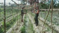 Persiapan Pertumbuhan Pare, Babinsa Sungai Raya Bantu Petani Pasang Tali Lanjaran