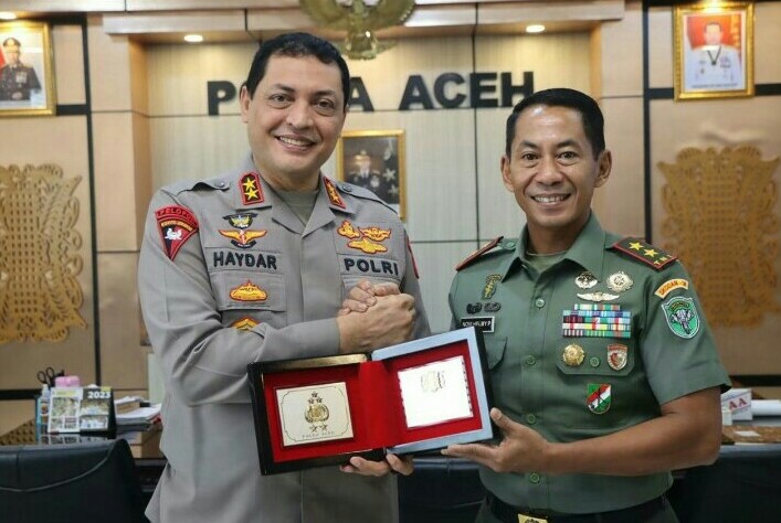 Kapolda Aceh dan Pangdam IM dalam kesempatan itu saling menyerahkan cenderamata, tutup Kabid Humas.