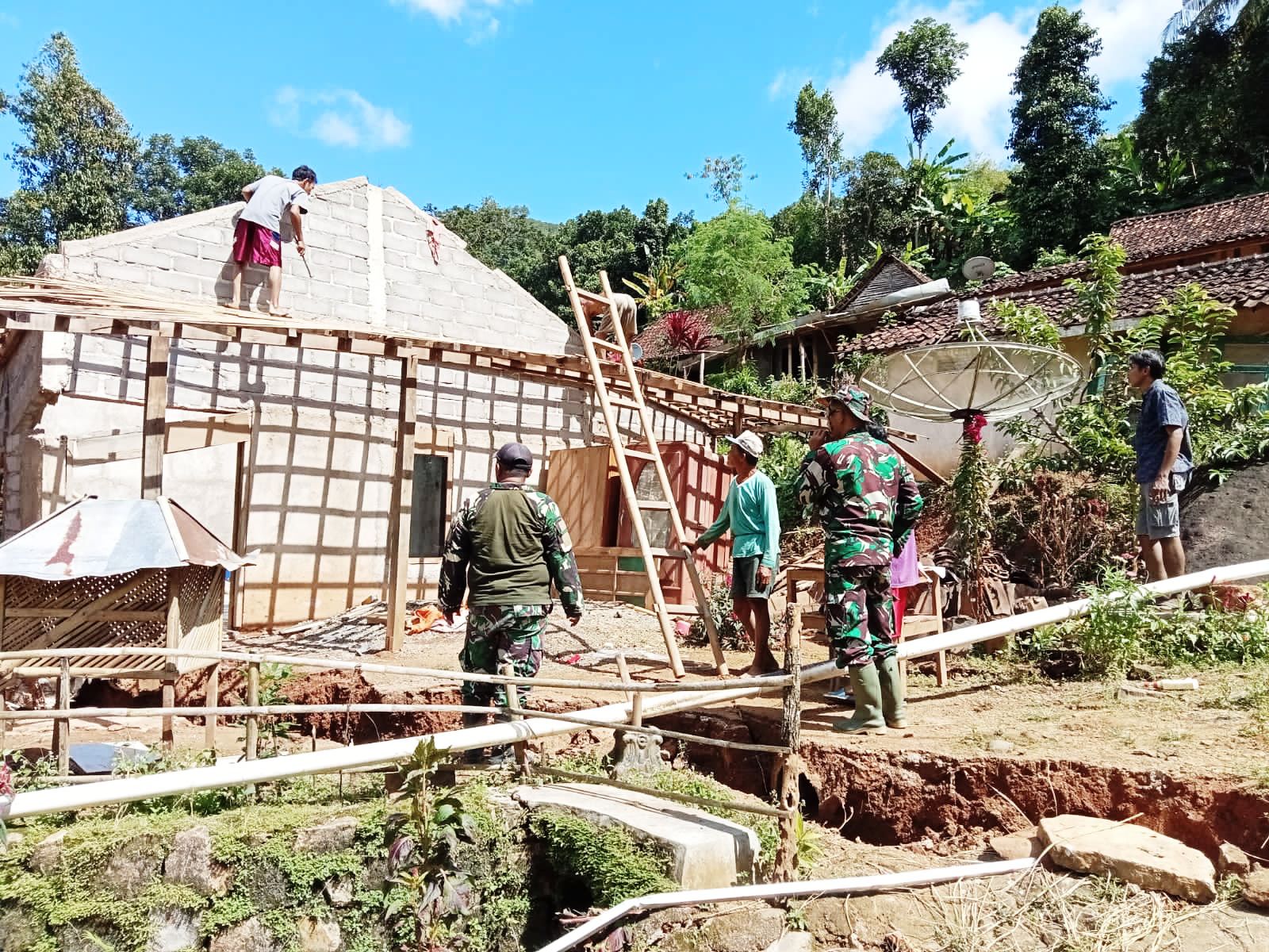 FOKUSPOST.COM | Wonogiri – Pasca terjadi bencana tanah bergerak, Personil dari Koramil 06/Batuwarno bersama warga setempat melaksanakan kegiatan karya bakti pembersihanmatrial yang menimpa rumah Milik Misman (52) yang berda di Dusun Mendung,RT.02/04 Desa Sendangsari,Kec.Batuwarno, Rabu (8/03/2023).