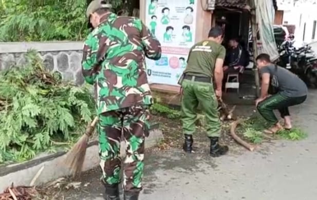 FOKUSPOST.COM | Surakarta – Babinsa Koramil 01/laweyan Kodim 0735/surakarta Serka giminanto dan serda Eko S bersama warga masyarakat melaksanakan kegiatan kerja bakti sosial membersihkan lingkungan area permukiman dan sekitaran kampung Kramat, Kelurahan Laweyan, Senin (17/04/2023)