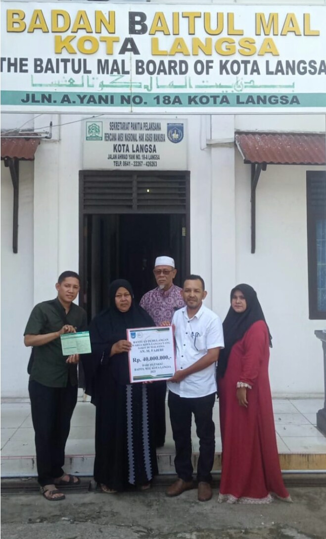 Sementara itu Kepala Baitul Mal Kota Langsa Drs.Ismail Janan melalui Sekertaris Baitul Mal Jauwahir. SE, M.A.P, Langsung memberikan bantuan, dengan berharap semoga bantuan yang diberikan Pemko Langsa Melalui Badan Baitul Mal dapat dipergunakan dengan sebaik baiknya, Sehingga Proses Pemulangan M.Fazeri yang sedang sakit di Hospital Sultanah Mora Ismail Batu Pahat Malaysia berjalan lancar dan sesuai yang kita harapkan,” imbuhnya