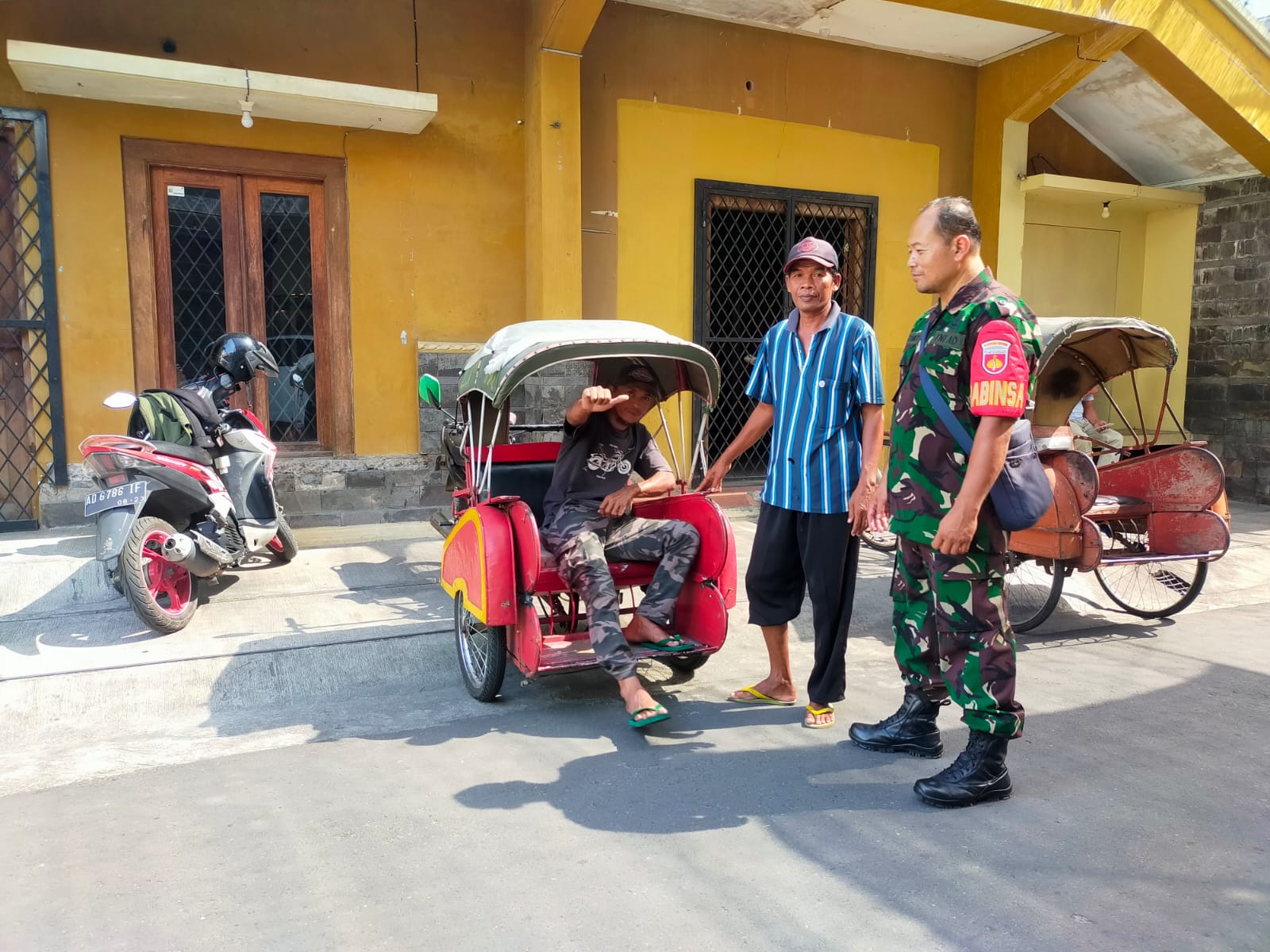 FOKUSPOST.COM | Surakarta – Babinsa Kelurahan Kauman Koramil 05/Pasar Kliwon , Kodim 0735/Surakarta Serka Sugiyanto melaksanakan kegiatan Komunikasi Sosial (Komsos) dengan Bapak Daryanto dan Mas Sarjito para pengayuh becak di Kampung Batik Kauman di Kelurahan Kauman di wilayah Rt 01 Rw 02 Kelurahan Kauman Kecamatan Pasarkliwon , Sabtu (15/07/2023).