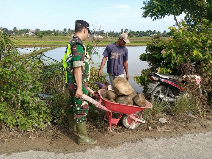 FOKUSPOST.COM | Aceh Timur – Babinsa Koramil 04/Peurelak, Kodim 0104/Atim, Serma Chandra Wanna, membantu dalam berbagai kegiatan pembangunan dan pemberdayaan masyarakat. Kali ini Babinsa tampak mendukung pembangunan infrastruktur irigasi sawah, di Desa Blang Pitrah, Kecamatan Peureulak, Aceh Timur, Minggu (10/09/2023).