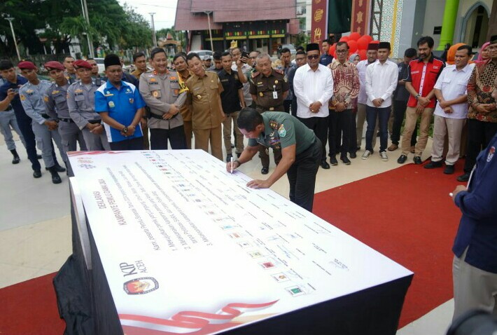 Hadir dalam deklarasi tersebut, Pj. Gubernur Aceh, Kapolda Aceh, Kabinda Aceh, Kajati Aceh, dan jajaran Forkopimda Aceh, Ketua KIP Aceh, Panwaslih Aceh, Para Ketua Parpol serta tamu undangan.