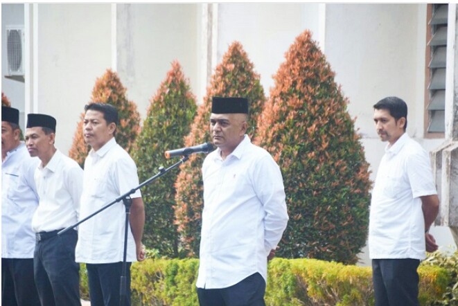 FOKUSPOST.COM | Langsa – Plt Sekda kota Langsa Muhammad Darfian memimpin apel pagi pada hari pertama kerja pasca cuti lebaran Idul Fitri 1 Syawal 1444 H di halaman kantor sekretariat Daerah Pemerintah Kota Langsa, Rabu (26/4/23).