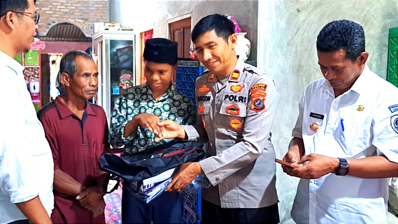 Sebagai bentuk perhatian dan kasih sayang, Kapolsek Panai Hilir juga menyerahkan tali asih dari Kapolres Labuhanbatu berupa tas, seragam sekolah, dan sepatu kepada Fauzan.