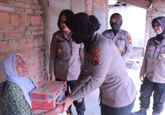 Penyerahan bantuan dilakukan oleh para personel Polwan Polres Klaten yang dipimpin oleh Wakapolres Klaten Kompol Tri Wakhyuni, S.A.P., M.M. Adapun bantuan yang diberikan yakni berupa paket sembako dan uang santunan yang diberikan kepada 10 KK.