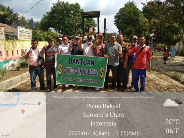 Pada jumat (14 /01/2022) PT Socfindo memberikan bantuan CSR kepada masyarakat desa Padang Mahondang Kec.Pulau Rakyat Kab.Asahan, berupa alat berat untuk penggerederan jalan dan bantuan paket sembako sebanyak 250 paket yang berisi 5 kg beras 1lt minyak makan dan 1 kg gula putih.