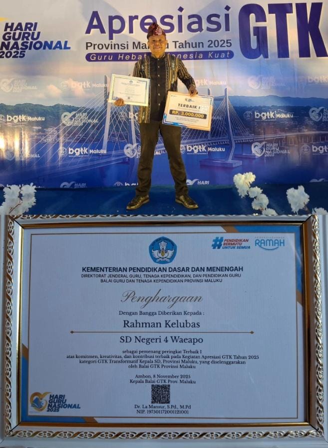 Alhamdulillah, dalam ajang Apresiasi GTK 2025, SDN 4 Waiapo dianugerahi Juara Terbaik Satu Kepala Sekolah Transformatif Tingkat Provinsi Maluku.