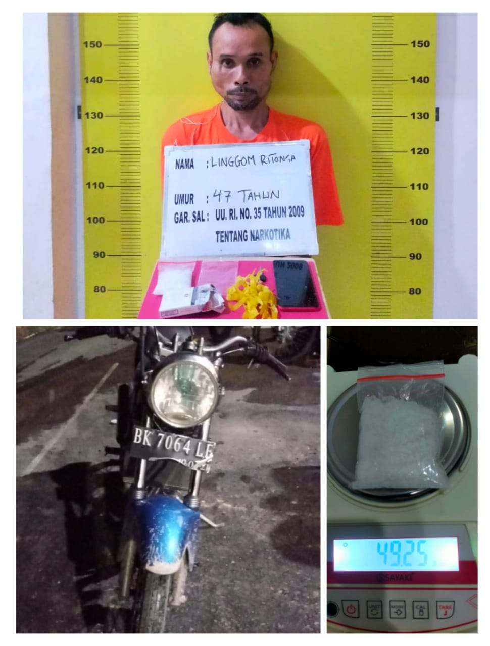 “Kemudian dilakukan penggeledahan badan dan ditemukan ditangan kanannya barang bukti berupa 1 buah bungkus kotak rokok Sampoerna berisi 1 plastik klip besar diduga berisi narkotika jenis sabu seberat 49,25 gram, 1 buah plastik klip kosong, dan dikantong ditemukan 1 unit handphone Android merk Oppo warna merah serta turut diamankan 1 unit sepeda motor merk Kawasaki Ninja warna biru Nomor Polisi BK 7064 LE.