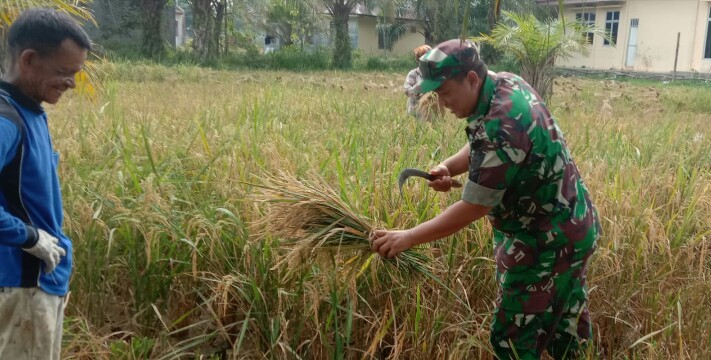 FOKUSPOST.COM | Aceh Timur – Koramil 17/Idi Tunong Kodim 0104/Aceh Timur, Serma Yusuf Hidayat melakukan pendampingan kepada para petani di Desa binaannya dengan terjun langsung ke sawah membantu petani panen padi di lahan persawahan milik Bapak Nurdin di Desa Seunebok Jalan Kecamatan, Idi Tunong Kabupaten, Aceh Timur Sabtu (29/04/2023).