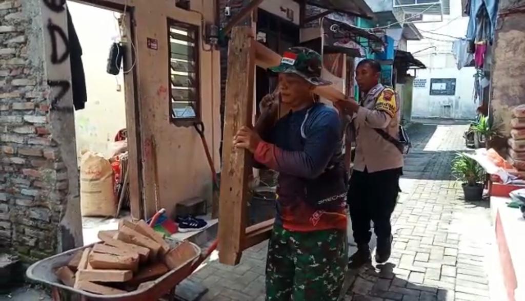 FOKUSPOST.COM | Surakarta – Sinergitas Babinsa Kelurahan Kepatihan Wetan Koramil 04/Jebres Kodim 0735/Surakarta Serda Budiono bersama Bhabinkamtibmas Brigadir Joko Supriyanto dan masyarakat terlihat kompak dalam karya bakti TNI rehab Rumah Tidak Layak Huni (RTLH) yang bertempat di rumah milik Bapak Ernawan Lilik Setianto Putro yang beralamatkan di Kampung Kepatihan RT 06 RW 1 Kelurahan Kepatihan Wetan Kecamatan Jebres, Rabu (15/3/2023).
