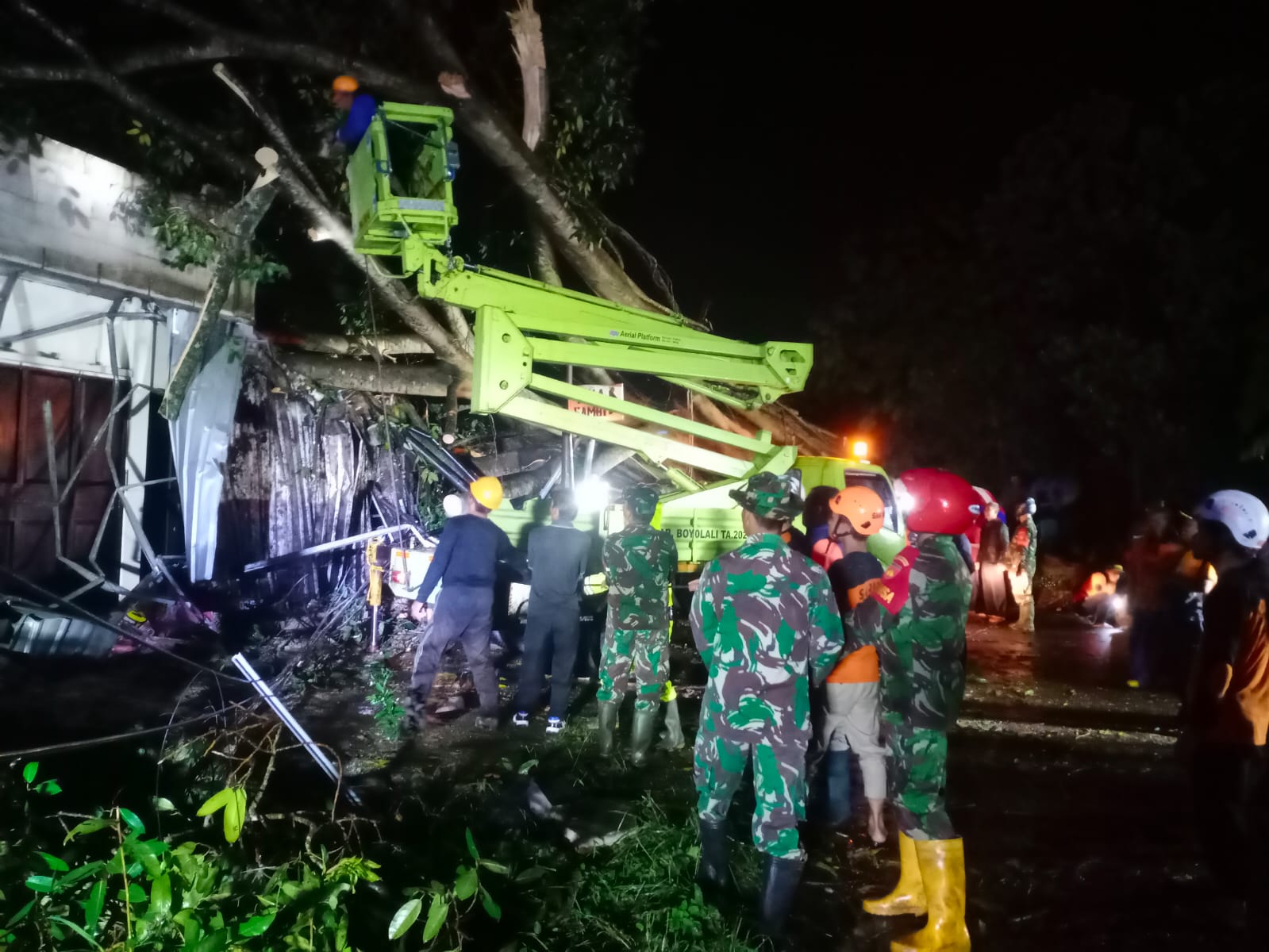 Bersama warga, Babinsa Koramil 10/Sambi Kodim 0724/Boyolali yang dipimpin Sertu Jakimin dan Babinkamtibmas Polsek Sambi dengan cepat menyingkirkan pohon yang tumbang tersebut. Di Bantu Alat berat, mesin senso dan parang, pohon yang tumbang disingkirkan dari jalan.