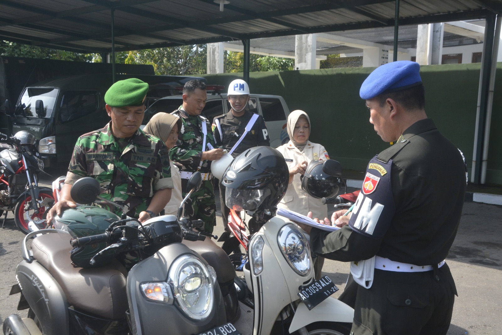 Untuk pemeriksaan kelengkapan fisik kendaraan dinas seperti spion, lampu, plat nomor kendaraan, nomor rangka mesin, lampu sen, dan harus dilengkapi dengan helm standart TNI AD. Kemudian kelengkapan fisik kendaraan dicocokkan dengan surat-surat kendaraan dan identitas pemegang kendaraan dinas,” jelasnya.