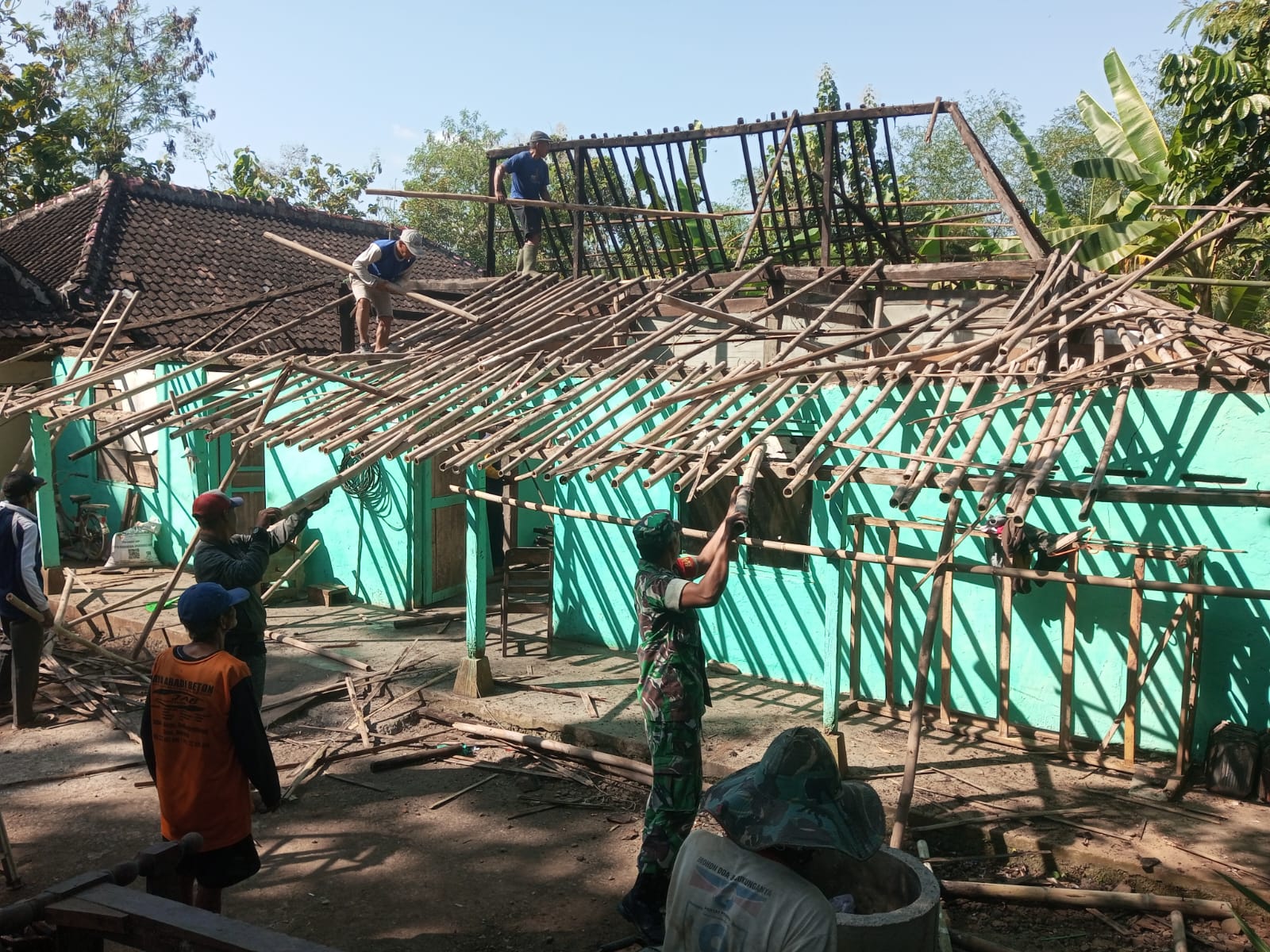 Tambah Babinsa Serka Marwoto, kami bersama masyarakat sekitar bahu membahu melaksanakan kerja bakti membersihkan puing-puing atap rumah dan bata bekas dinding yang masih bisa di pakai.